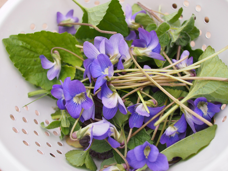 Violets can be used for more than violet crowns and bouquets. Although sometimes considered a lawn weed, violets are edible as well as beautiful. Just make sure they haven’t been sprayed with chemicals and wash them first. To make gathering wild edible violets easy, I use a $3 mini colander from World Market. It’s only available in store, so here are some other ideas if you don’t have one near you. It’s also great for herbs, berry picking and other small garden harvests.