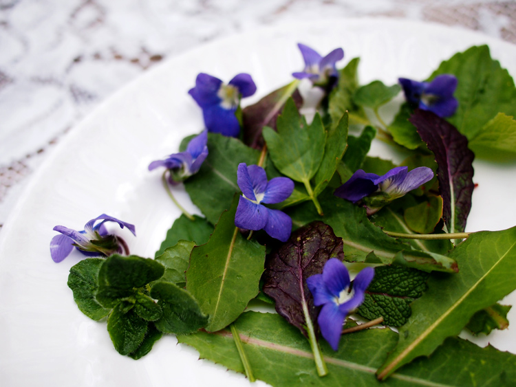 Add a handful of violet flowers to a salad for a pop of color. The flowers don’t have a strong taste so they blend right in. Violet leaves are also edible so try adding those to a salad too.