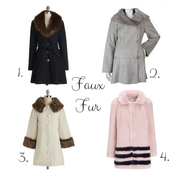 1. Steve Madden Plush Coat 2. Dennis Basso Faux Fur Coat 3. Hell Bunny London Coat 4. Shrimps Faux Fur Dulcie Coat