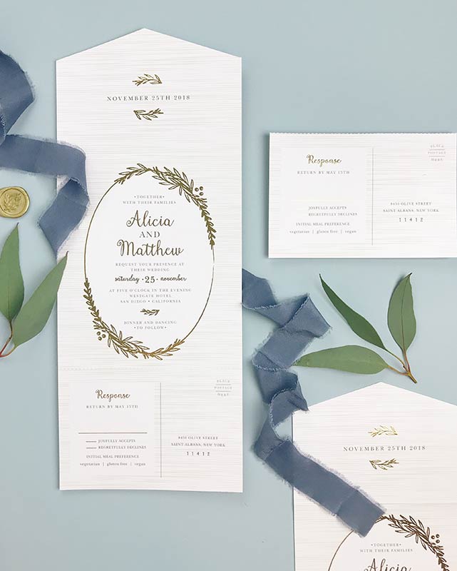 A shiny favorite, foil on stationery is a big hit. Also available from Basic Invite are rose gold foil and foil place cards.