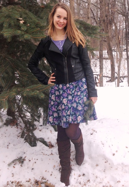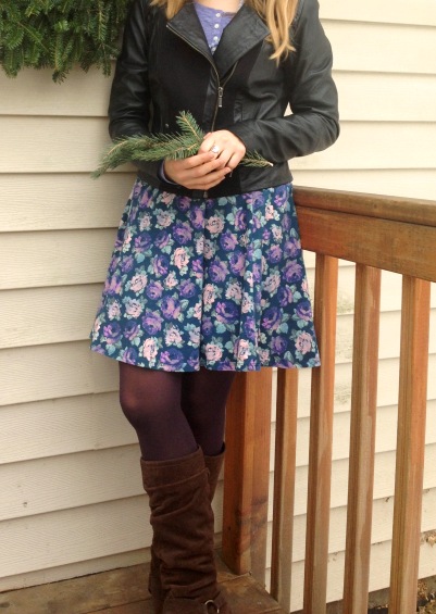 Mixing textures is key for fashion this winter. The shiny black leather with the petite floral pattern make me happy. I first wore this outfit with black boots, but the amount of leather felt overwhelming. So I switched it up and paired it with brown suede boots and liked it better.